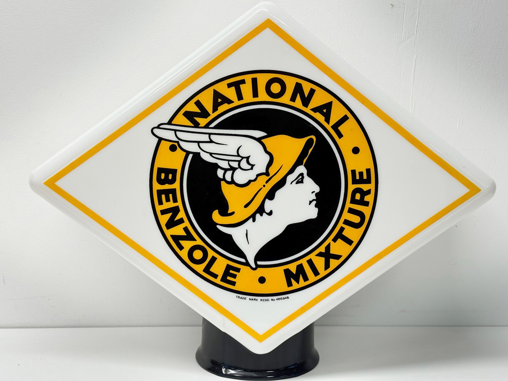 The National Benzole Mixture and Power vintage glass petrol pump globes are estimated at £1,000-£1,500 each.