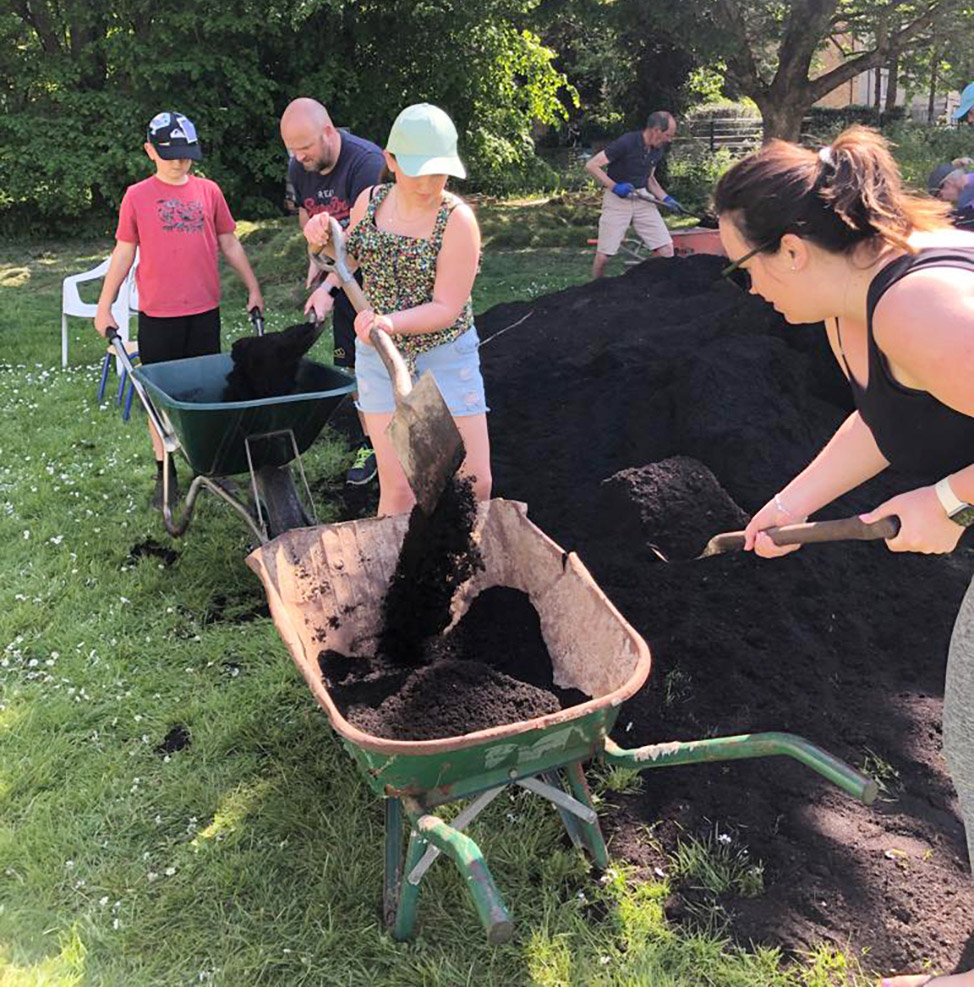 Over the weekend many hard-working, volunteers of all ages transformed the field into a garden with 12 dug beds for flowers veggies, a large soft fruit area and a huge no-dig section – and 10 cubic meters of compost was wheelbarrowed and put on top of all the beds! The turf that was taken down to the children’s area in the planned garden and transformed into magical grassy structures under the trees – including a snake, turtle and a fun donut ring!