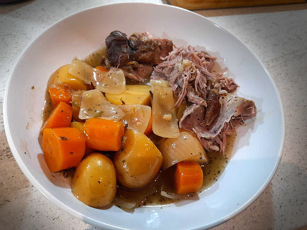 Having just had a new patio laid, we couldn’t dig a hole in the ground, so we used the slow cooker. The meat just fell off the bone and tasted really good. We had enough left to make wraps the next day.
