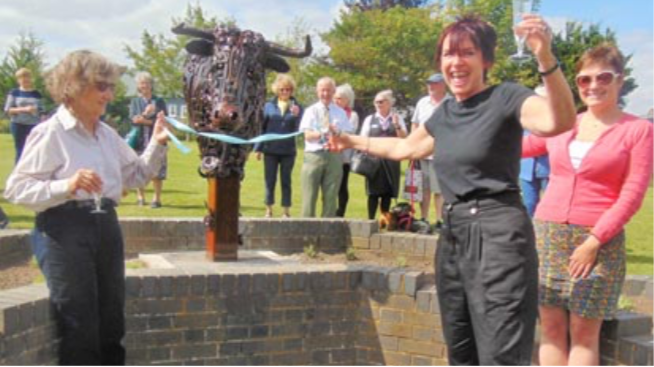 The resulting £3,000 was used to commission and purchase the cow’s head fashioned out of recycled nuts, screws, pliers, scissors, spanners and springs by Mark Galbavy of the Dorset Forge & Fabrication in North Wootton. The town council agreed that it should be sited on land in their ownership in the Railway Gardens, rather than on the plinth which is owned by The Exchange, and supporters gathered to toast the new arrival in the raised bed sensory garden, which has been replanted with lavender plants by Stour Connect.
