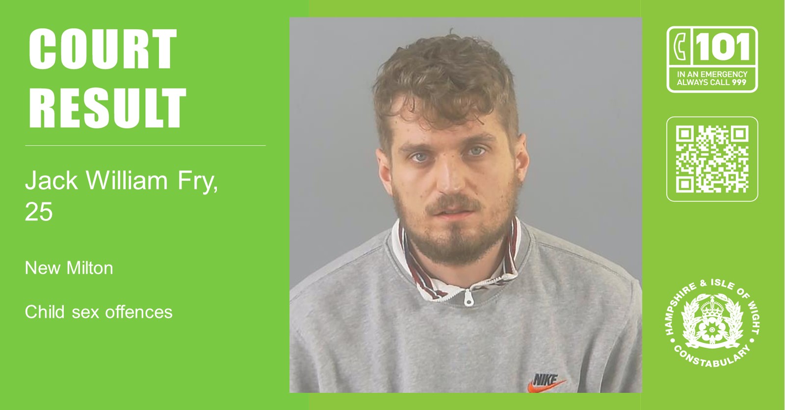 Detective Constable David Sloan, of Hampshire Police’s Child Abuse Investigation Team, said: “I am so pleased for the young victim in this case that justice has now been served for them and their family, and that Fry has now been placed behind bars, where he belongs.