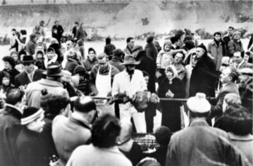 Television cameras joined the scores of amateur photographers who were recording the scene for posterity. In the space of a couple of hours all the beef was sold and so great was the demand for sandwiches that more bread had to be fetched from a local bakery.