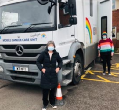 Alison Day receives chemotherapy for breast cancer and monthly immunoglobulin therapy for Waldenstrom’s Macroglobulinemia from the Mobile Cancer Care Unit, which treats patients in the car park at Peacemarsh Surgery twice a week. Alison was so grateful to be treated in Gillingham without the need to travel to Salisbury, she decided to raise much-needed funds for the service, which runs ten buses across the country.