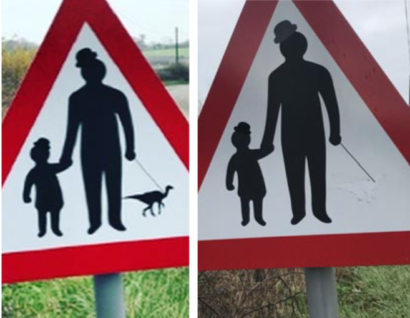 Since covid-19, the mystery artist has gone to ground with no more adaptations, although his signs have remained intact. Until now. The velociraptor’s involuntary disappearance was broadcast on Facebook last week by Alan Newport of Marnhull.