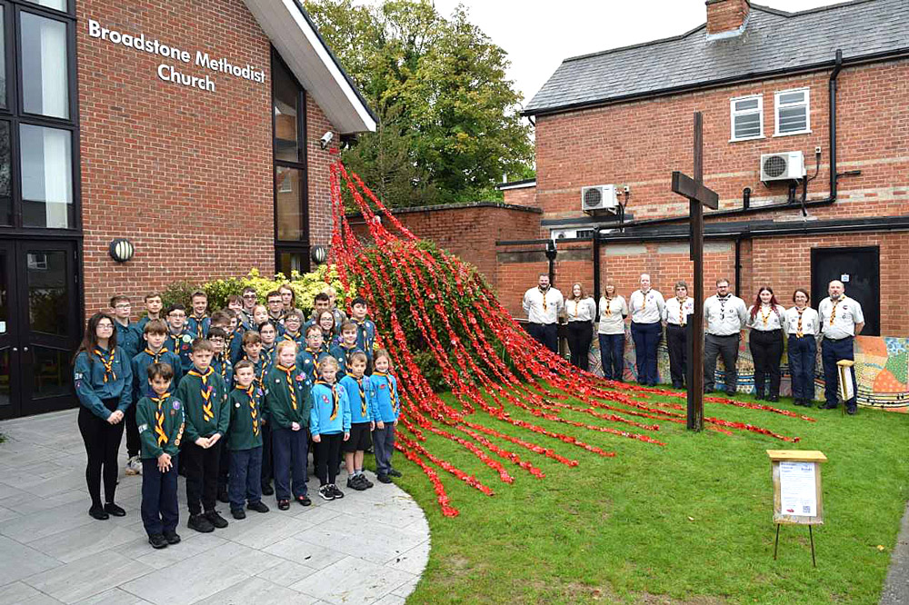 More than 200 Beavers, Cubs, Scouts and Explorers from Broadstone Scout Group, with their Leaders, have been busy recycling plastic bottles into poppies for a massive display outside Broadstone Methodist Church in the village centre.