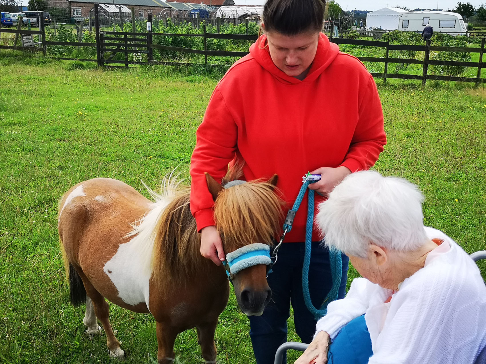 Fernhill resident Gwen Jellis and High Mead helper Emily Horne with Shetland pony