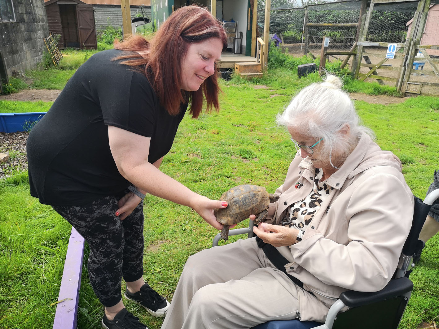 Fernhill resident Joan Vohra holding a tortoise with High Mead staff member Faye Bessant