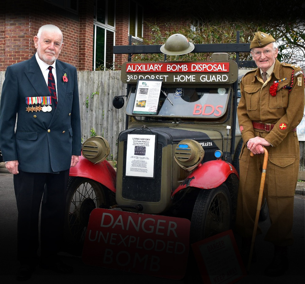 In Ferndown: Two Ferndown stalwart veterans in full regalia proudly stood to attention by the splendid 3rd Dorset Home Guard Auxiliary Bomb Disposal display by Ferndown Royal British Legion for their Remembrance Service.