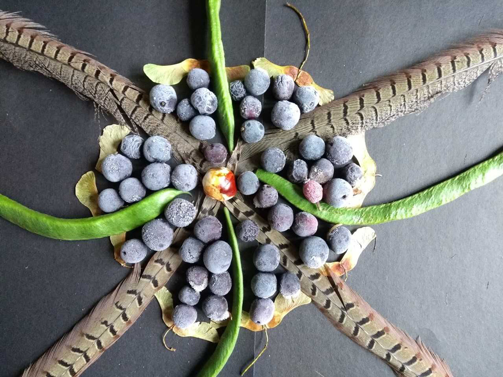 I had been ogling Diana Heynes’ Conker mandala on Facebook and looking forward to making my own. However, after several ‘reccies’ round our village it seems the horse-chesnut trees are not quite ready to relinquish their treasure! We did manage to find one and, although partially white, it makes a great central point for the mandala.