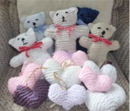 Member Diane Traves, whose knitting is pictured, has been making teddies for people who have lost babies and hearts for people who have lost loved ones to covid.